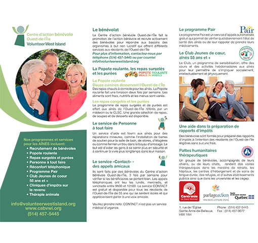 The design for the 2016 annual report focused on the volunteers inserted in the logo to demonstrate community groups with in Volunteer West Island. The annual report was created using InDesign CS6 and Photoshop CS6.